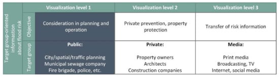 Visualization levels by objective and target group for flood risk communication. Adapted from [38].