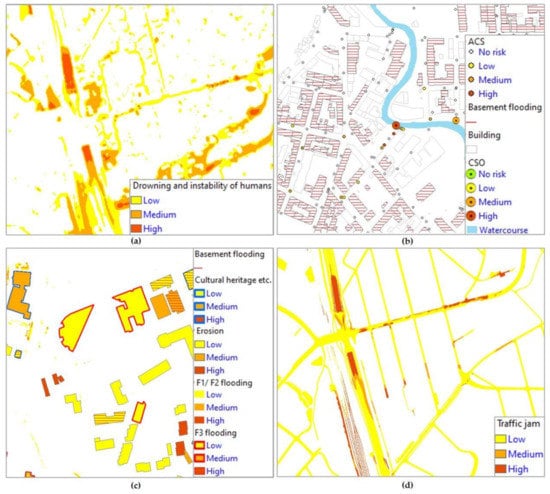 Risk of: drowning and instability of humans (a); pollution from CSO and ACS (b); building damage (c); and traffic jams (d) in the test area, Akerselva, at 200CF.