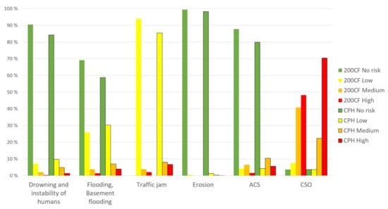 Risk distribution (no risk, low, medium, high) for different risk types for the test area (Akerselva) at 200CF and CPH in % of total area or total amount of infrastructure per risk type.