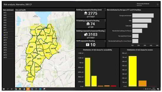 Results of the analysis were implemented in a visualization tool, ArcGIS online. The map in the test version of the visualization of results for Akerselva shows the risk to human life and health (Figure 8). The total number of buildings exposed to flooding was 2775 of 17,657, shown to the map’s right. 74 of 189 buildings with vulnerable functions (F3) in the area were exposed to flooding. The bar graph gives an overview of risk distributed by the type of F1 and F2 facilities; e.g., approximately 440 flooded buildings were used for garages and annexes, and 200 were two-apartment houses. The dashboard also provides information on how many buildings could experience basement flooding from CS (3103 of 17,657) and how many pump stations and transformers were at risk of flooding at 200CF (10 TS/PS). At the bottom of the dashboard, the distribution of risk classes for human life and health, accessibility, and erosion are presented in bar charts. All of that information is available for the entire area and per subcatchment in this example. The desired subcatchment can be selected in the overview to the left of the map.