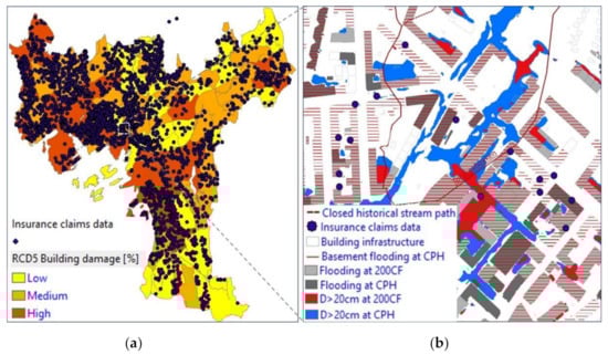 (a) Verification of registered insurance claim data vs. calculated building damage at CPH distributed on administrative districts in Oslo; (b) an example area in Oslo with coincident and noncoincident registered and calculated building damage.