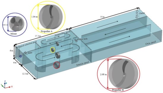 The A2/O OD is located in Xiaoxian County, Shandong Province, China, and is 6 m deep (H), 18.6 m wide, and 62.6 m long, as depicted in Figure 1. In the treatment process, the wastewater goes through four sections within the OD. First, it enters at the top of the biological selection pool, in the lower-left part; measuring 6 m wide by 9 m long and containing two agitators with diameter a of 0.4 m, hub height of 1.3 m, and rotation speed of 550 rpm. Afterwards, it circulates into the anaerobic pool, just behind the biological selection pool, containing two side-by-side propellers of diameter 1.84 m, rotation speed of 61 rpm, and hub height 1.8 m.