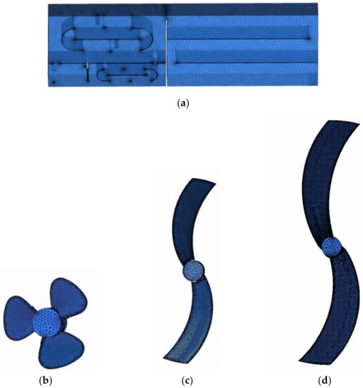 Meshed channel and blades of the OD. (a) The whole flow channel; (b) Agitators; (c) Propeller A; (d) Propeller B.