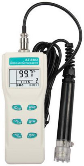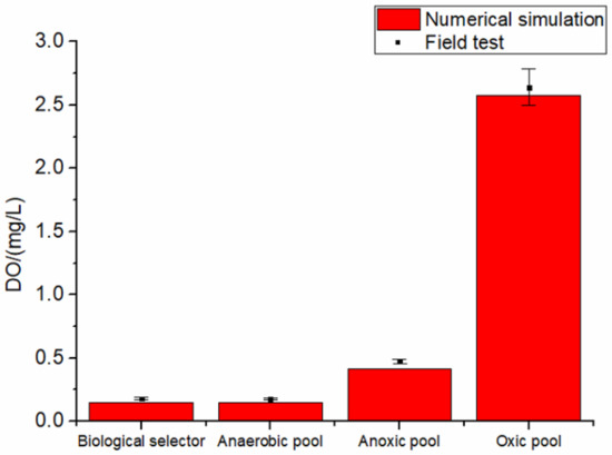 Monitoring tests are performed to compare and analyze the concentration of DO in different regions, whilst the specific field test method and a comparison with a numerical simulation can be found in Zhang et al. [18]. The DO monitoring instrument was an AZ8403 portable DO meter (Figure 3); the range of measurement was 0–19.99 mg/L, the accuracy was ±1.5 F.S, and the resolution was 0.01 mg/L. Before the measurement, the saturated DO content was automatically calibrated according to the ambient temperature. During the measurement, one set of data was measured every 1 s, and the data time length was 90 s. A comparison of the mean simulated and measured (along with standard deviation) DO concentration in the four regions is shown in Figure 4. As can be seen, the simulations and DO concentrations in all areas are consistent, although the standard deviation in the oxic pool is much larger than in the other areas. These differences are explained by the action of the aeration device in the aerobic zone, resulting in the large local measurement fluctuations.