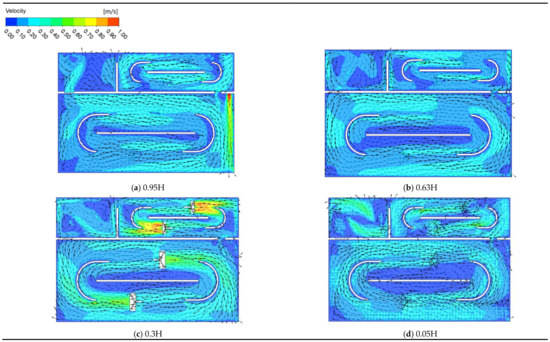 Velocity distribution in the OD at the X-Y cross sections: (a) 0.95 H, (b) 0.63 H, (c) 0.3 H, (d) 0.05 H.
