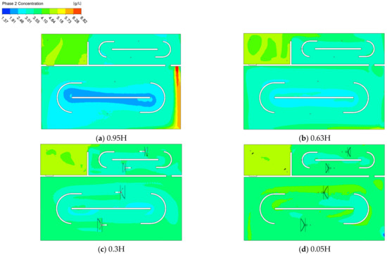 Figure 6 shows the distribution of sludge concentrations at different bed heights. It can be seen how the sludge concentration in the biological selection pool is relatively high (~4.64 g/L), due to its role in cultivating the sludge, regardless of the studied depth. The zones around the oval-shaped diversion wall of the anaerobic and anoxic pools tend to manifest low volume fractions, owing to the large water circulation; although these tend to increase near the bed surface. Notably, the sludge concentration around the reflux zone is the highest near the bed surface, where flow is fast, but becomes homogeneous lower down. However, the same finding is not pertinent to the fast flows around the propellers, and it may be the case that the sludge concentrations are connected with the flow patterns resulting from the pushing of the propellers and hitting the walls. Therefore, there is no obvious correlation between the local velocity and sludge concentration, as depicted in Figure 5 and Figure 6.