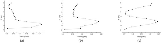 Curves of average velocity at each section. (a) Biological selection pool; (b) Anaerobic pool; (c) Anoxic pool.