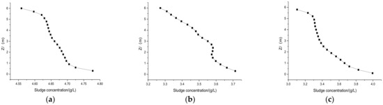 Curves of average sludge concentration at each section. (a) Biological selection pool; (b) Anaerobic pool; (c) Anoxic pool.