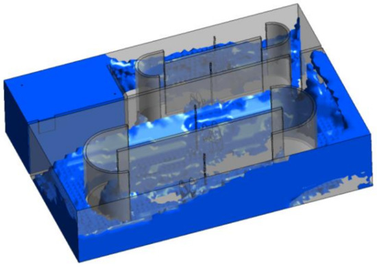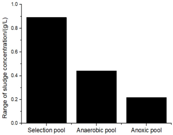 To further analyze the relationship between flow rate and sludge settlement, the curves of average velocity and sludge concentration of the three pools with transverse distance are drawn in Figure 7 and Figure 8. It can be seen that the average sectional velocities in the three pools increased and decreased between Z = 0 and Z = 3.5, and peaked at the height of the corresponding agitators or propellers: 0.25 m/s for the biological selection pool, 0.28 m/s for the anaerobic pool, and 0.21 m/s for the anoxic pool. Thereafter, the velocities of the flow tended to stabilize for the biological selection and anaerobic pool, but increased again for the anoxic pool; it is, therefore, likely such trend is connected with the reflux slot. The sludge concentration in the OD decreased overall with height and the ratio of minimum to maximum sludge concentration varied for each pool: 4.55/4.76 = 0.96 for biological selection, 3.3/3.7 = 0.89 for anaerobic, 3.1/4 = 0.775 for anoxic. These results indicate that the sludge is both greater and more concentrated in the biological selection than in the other pools. Figure 9 depicts the areas (blue) of the three-dimensional OD with a sludge concentration greater than 3.7 g/L. High concentrations are observed around the whole biological selection pool, bottom and inlet of the anaerobic tank, flow path of the reflux slot, and walls of the anoxic pool. The largest range, and the majority of the extreme sludge concentration values simulated (Figure 10), pertained to the biological selection pool. Notably, the areas of high sludge concentration at the bottom of the OD contain slow flows.