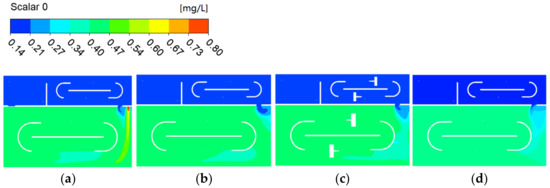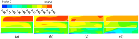 In the studied scenario, the concentration of DO in the reflux slot was 0.8 mg/L and in the aeration pool, 5 mg/Ls. This DO distribution is illustrated in Figure 12, Figure 13 and Figure 14. It is evident the conditions of anaerobic bacterial reaction are met, since the DO in both the biological selection and the anaerobic pool are uniform and below 0.2 mg/L, and in the anoxic pool around 0.5 mg/L; except at the transition zone, the reflux area. As the DO concentration at the inlet is controlled to a low level, the DO in the reflux zone is augmented with transverse distance, peaking at 0.8 mg/L, near the bed surface (Figure 12a). When the sewage flows into the oxic pool, the DO concentration gradually increases under the influence of the aerator’s oxygenation rate and DO consumption rate, thus the DO is higher transversally, laterally, and along the flow direction (Figure 13). As a result, the concentrations of DO in the first and second flow-passing sections are lower near their entrances, whilst in the third section, the DO increases in the exit zone and becomes high and homogenous across the entire section near the bed surface.