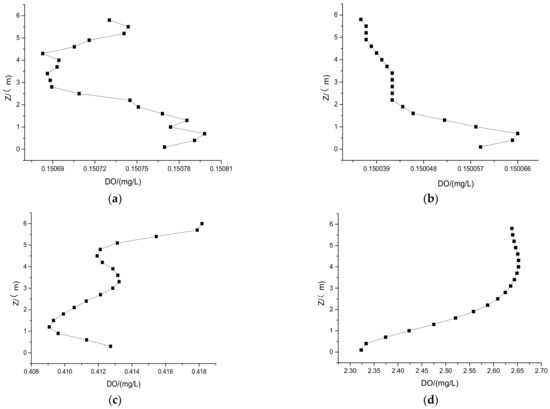 In order to obtain further information about the oxygen distribution, the transverse DO concentration of the four pools is calculated in Figure 14. Clearly, the DO remains constant at 0.15 mg/L for the biological selection and anaerobic pools, and at 0.412 mg/L for the anoxic pool, but increases transversally from 2.3 mg/L and plateaus to 2.65 mg/L at Z = 4 for the oxic pool.