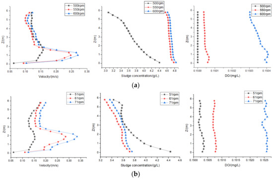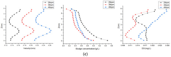 The influence of rotation speed on the distribution of velocity, sludge, and DO with height were investigated in the three pools by adding and subtracting 50 rpm to the agitators’ original state ( ± 9.1%) and 10 rpm to the propellers’ ( ± 25.64%).