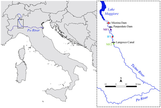 - MF2 (Minimum Flow 2), located 23.5 km downstream from the Panperduto Dam, and short distance (i.e., 1.5 km) below the intake of the Langosco Canal. At this site, a MF amounting to 2–4% of the MANF is released, which is gradually increased through further downstream contributions, reaching the same MF values as in MF1 in a few km.