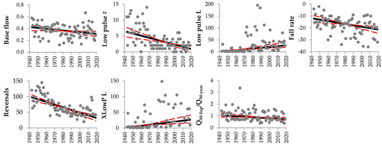 Data and Sen’s slope estimates of the hydrological parameters concerning the Lake Maggiore outflows recorded during the period 1943–2019 characterized by significant monotonic increasing or decreasing trend as detected by the Mann-Kendall test or its modified version [32] (see Table 1). Base flow = 7-day minimum flow divided by mean annual flow, Lo pulse # = number of annual low pulses, Lo pulse L = median duration of low pulses (days), Fall rate = median of all negative differences between consecutive daily values, Reversals = number of hydrologic reversals, XLowP L = median duration of extreme low-flow periods (days), QM-Sep/QM-year = mean flow of September divided by mean annual flow. Black and dashed red lines represent Sen’s estimate and 95% confidence interval, respectively.