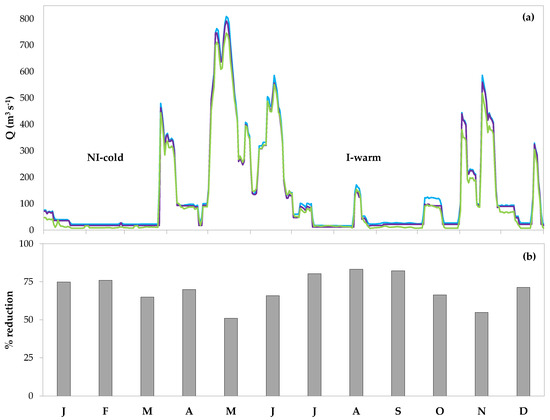 (a) Mean daily streamflows of the Ticino River at the three study sites downstream of water withdrawals (IF1 = blue line, MF1 = purple line, MF2 = green line) of a typical year during the study period (2010). (b) Monthly averaged streamflow reduction (%) at MF1 compared to the lake outflow, calculated over the period 2010–2015. NI-cold = Non-Irrigation-cold period of low flows, I-warm = Irrigation-warm period of low flows.