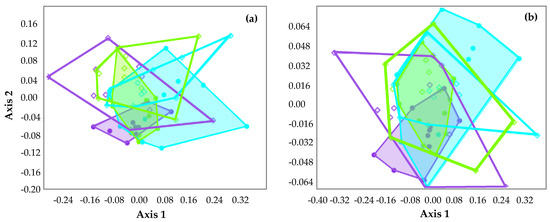 Non-metric multidimensional scaling (NMDS) showing the Bray–Curtis distances between benthic assemblages collected at the three sampling sites (IF1 = light blue; MF1 = purple; MF2 = green) in the different periods (I-warm = filled dots and convex hulls; NI-cold = empty diamonds and convex hulls), taking into account taxonomical composition (a) and composition in functional feeding groups (b). Stress values: 0.17 (a) and 0.07 (b).