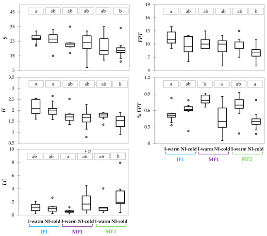 From the comparison of sites within the same sampling period, only H was significantly different (Kruskal–Wallis and Dunn test, p < 0.05) between IF1 and MF2 during the NI-cold period, and %EPT between IF1 and MF1 during the I-warm period (Figure 5).