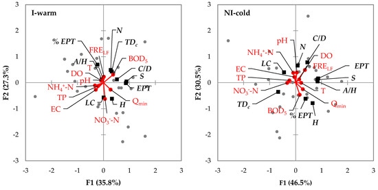 Redundancy analysis (RDA) of the ecological (benthos metrics) and environmental (hydrological and physico-chemical) variables. Only the two hydrological variables mainly contributing to PC1 and PC2 axis of the principal component analysis (PCA) were selected (see Figure S1). I-warm = Irrigation and warm period, NI-cold = Non-Irrigation and cold period. FRELF = number of low-flow days, Qmin = minimum value of flow, T = temperature, DO = dissolved oxygen, EC = electrical conductivity, NH4+−N = ammonia nitrogen, NO3−−N = nitrate nitrogen, TP = total phosphorus, BOD5 = biochemical oxygen demand in five days, N = total density of macroinvertebrates, S = family richness, H = Shannon-Wiener diversity index, EPT = richness of EPT taxa, %EPT = relative abundance of EPT taxa, C/D = the ratio of Chironomidae/Diptera individuals, A/H = auto/heterotrophy, TDc = top-down control, LC = life cycle.
