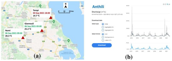 Figure 1b presents the application for retrieval of raw and processed time series of river discharge. The user can view, in a diagram, raw or aggregated (hourly, daily) discharge data from Anthili station. In addition, the user can download the selected time series in various formats.