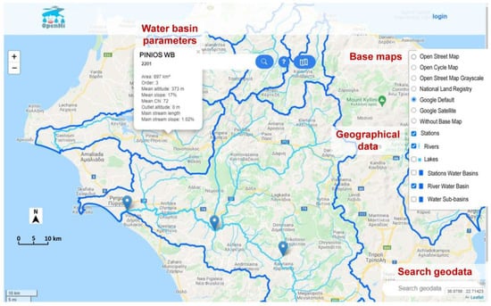 In Figure 2, certain features of the application are depicted. For a selected water basin, its boundaries and the processed parameters (area, slope, mean altitude etc.) appear in a window. The application supports several base maps (Open Street, Google etc.) and offers geographical data (stations, rivers, water basins etc.). A geodata search capability is also provided for reading the geographical names stored in the database and zooming to the relevant boundary.