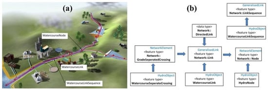 (a) Physical representation of elements; (b) database and relations for the hydro network model (adapted from []).