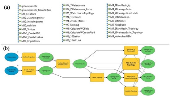 Elements (watercourse node, watercourse link, watercourse link sequence) are referred to a hydro-model as specified from the INSPIRE Directive. Elements such as wastewater treatment plans are not part of the network schema. A physical representation of elements is depicted in Figure 4a, while the relative unified modeling language diagram is presented in Figure 4b. Spatial relationships between features (watercourses, basins, nodes) are defined using relevant and validated topological rules of hydrology. A toolbox with several models was created to perform the geographical processes and to run calculations of spatial and geomorphological attributes, Figure 5.
