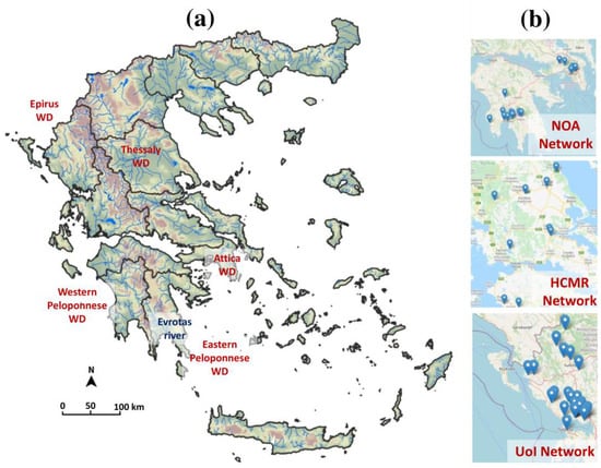 (a) Rivers, lakes and water districts of Greece, (b) pilot networks of NOA, HCMR, and UnIo.
