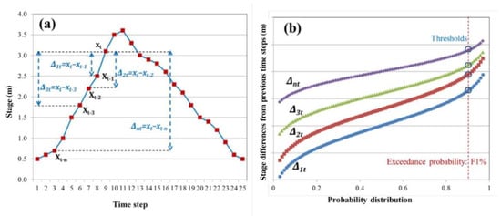Examination of time evolution of river stage: (a) calculation of the differences of the current value from previous values and (b) definition of thresholds.