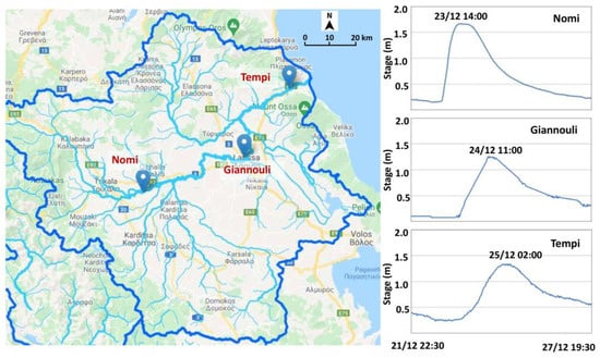 The analysis of the recorded stages in Pinios river during major flood events reveals considerable travel times of the flood peak from the upstream station Nomi to the intermediate station Giannouli and the downstream station Tempi. In the flood event of 22–26 December 2019 that is presented in Figure 8, the travel time of flood peak between the two upstream stations is 21 h and between the two downstream stations about 15 h. Although the formation and propagation of the flood wave depends on the magnitude and spatio-temporal pattern of the rainfall, these time lags are long enough to provide downstream communities with the time needed for adequate preparation.