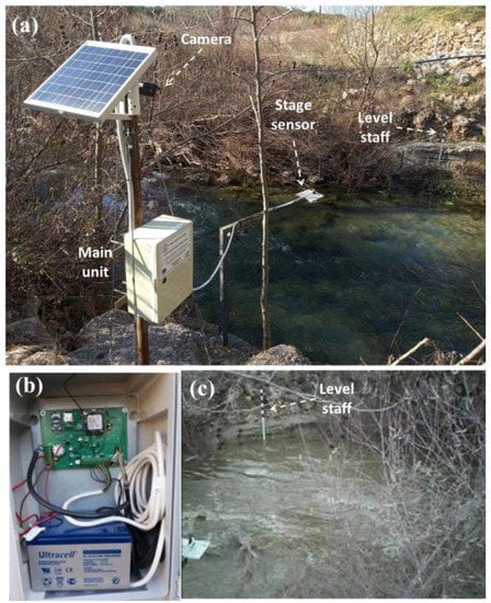 (a) Station equipped with main unit, ultrasound stage sensor, air temperature probe, solar panel, VGA camera, antenna and conventional level staff, (b) box containing the station’s main unit, (c) shot taken automatically by the VGA camera.
