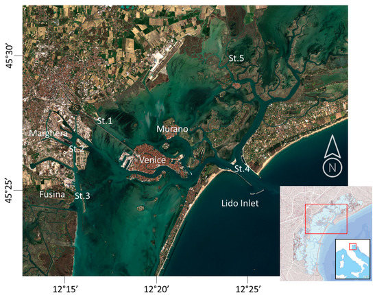 The VL (Figure 1) is a large (550 km2) Mediterranean coastal transitional environment located in Italy, in the Northeastern part of the Adriatic Sea. It has an average depth of 1 m, and it is morphologically characterized by the presence of canals (5–10 m deep) and of a multiplicity of aquatic (e.g., salt marshes, shoals, and mud flats) and terrestrial (e.g., islands, coastal strips) habitats. The VL is microtidal, poly- and euhaline, and, in terms of confinement, it has both choked and restricted waters [19]. Two long barrier islands separate the lagoon from the Adriatic Sea to the east, allowing for water exchange through three large inlets (Lido, Malamocco and Chioggia), each corresponding to a specific basin inside the lagoon (north, central and south). Water exchange in VL is governed by the Adriatic tides, whose average amplitude ranges between 20 cm at neap tides and 100 cm at spring tides. The average residence time of VL waters is around 10 days, varying from a few days close to the inlets to 30 days for the internal areas [20,21]. The yearly freshwater discharge in the VL, coming from twelve main tributaries, is about 35 m3 s−1 on average, with seasonal peaks in spring and autumn. The VL is subjected to high levels of various anthropogenic pressures, due to the presence of urban areas, tourism, fishing, aquaculture, hydro-morphological interventions, industrial sites, and agricultural lands in the watershed. The five LV stations (Figure 1), where the long-term studies are carried on, are fairly well representative of the northern (St. 5) and central (Sts. 1, 2, 3 and 4) basins. The northern one is characterized by the presence of tributaries draining the waters from an intensively cultivated hinterland; the central one is subject to strong nutrient enrichment from the city of Venice and from the major islands, and it receives treated urban waste waters from the urban centre of Mestre and the discharge of wastewaters and cooling waters from the nearby industrial areas of Fusina and Marghera (Figure 1).
