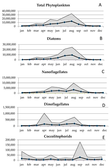 Seasonal patterns of mean monthly abundance (cells L−1) of (A) total phytoplankton abundance. (B) diatoms, (C) nanoflagellates, (D) dinoflagellates and (E) coccolithophorids. Black lines and shaded areas represent, respectively, the average values and the standard deviations over the 20 years.