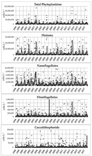 Phytoplankton was fixed in neutralized formalin with hexamethylentetramine, recognized and counted with an invertoscope after samples had settled in 2–25-mL chambers, for 12–24 h. Cell counting was carried out at 400× magnification along transects, whose number varied depending on cell abundance, to count a minimum of 200 cells (but often more than 500) in each sample [25,26,27]. Over the study period, two different operators analyzed the phytoplankton samples using the same technique and with accurate intercalibration. Taxa composition was mainly defined in accordance with [28,29]. All the species were reviewed and conformed to any synonyms through the World Register of Marine Species WoRMS (https://www.marinespecies.org (accessed on 4 October 2021)) and the World’s Algae databases Algaebase, (http://www.algaebase.org/ (accessed on 4 October 2021)). The analysis was confined only to those forms that were detectable by light microscopy, i.e., up to 3 μm, thus not considering the picophytoplankton fraction. For a detailed analysis of interannual variations and trends, we focused only on the four major groups of phytoplankton: diatoms, nanoflagellates, dinoflagellates and coccolithophorids. For the dinoflagellates, no distinction has been made between autotrophic and heterotrophic species, which were therefore all included in the countings. The nanoflagellate group contained all the undetermined organisms, whose size was always less than 10 μm, mostly around 3–4 μm, mainly consisting of cryptophyceans, chrysophyceans, prymnesiophyceans (except coccolithophorids), chlorodendrophyceans and undetermined flagellates.