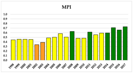 Interannual variations of the MPI. The colours correspond to the selected classes of ecological status (Poor = Orange; Moderate = Yellow; and Good = Green).