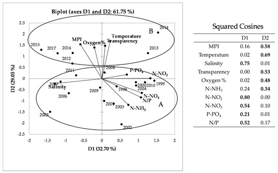 To investigate the relations of MPI with hydrochemical parameters, we performed a PCA (Figure 5). The bi-plot of the first two PCA components explained about 62% of the total variance. The squared cosine values identify the variables best linked to each of the two axes: the greater the squared cosine, the greater the link with the corresponding axis and, consequently, the influence of the variable along the axis. The first axis mainly explains the variability related, on one side, to salinity and, on the other, to nitrogen nutrients and N/P ratio. The second one explains the variability related to O2 percentage, water transparency, water temperature and MPI, which are inversely correlated with N-NH3 and N/P ratio. These variables allow evidencing in the PCA two clusters of consecutive years (Table 4 and Figure 5): cluster A and cluster B that group, respectively, the first 14 years (1998–2011) and the most recent ones (2012–2017). The division of these two groups occurs at the value 0.5 of the second component. The ordering of the years in relation to the first two main components appears to be fairly consistent with the MPI values (Figure 4) that appear to be the highest in well-oxygenated, transparent and less nutrient-rich waters. Indeed, the comparison of the two periods (Figure 5 and Table 4) indicated statistically significant differences for transparency, temperature and relative oxygen, which were highest in the second period. As regards nutrients, ammonium, nitrites and nitrates decreased significantly in recent years, resulting as well in a lower N/P ratio [17]. These changes in environmental variables were accompanied by an increase of the water quality assessed with MPI, which was significantly higher in the most recent years (2012–2017). For what concern the bloom species, three of them decreased (Skeletonema spp., small Nitzschia spp., Cylindrotheca closterium), while two (small Chaetoceros spp. and Thalassiosira spp.) increased.