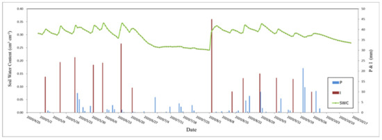 The precipitation (P) and irrigation (I) volumes and the diurnal variation in soil water content (SWC) of Chinese cabbage throughout the observation period.
