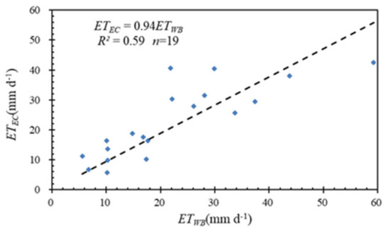 The water balance method is generally regarded as an accurate method for calculating ET over a long period of time [25]. In our study, the results from the water balance method were used to test whether the ET measured by the eddy covariance method was reliable. Figure 2 shows that the weekly ETEC and ETWB were consistent at different growth stages (ETEC = 0.94ETWB, R2 = 0.59, n = 19).