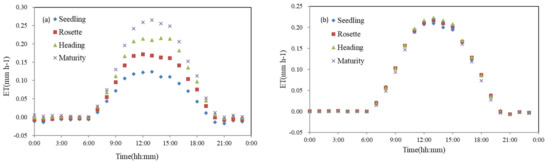 (a) Diurnal ET variation of Chinese cabbage at different growth stages of the first crop; (b) diurnal ET variation of Chinese cabbage at different growth stages of the second crop.