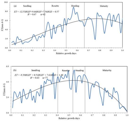 (a) Seasonal ET variation of Chinese cabbage throughout the growing period of the first crop. Relative growing days (RGDs) refer to the normalized growing days, e.g., “1” represents 61 days after sowing; (b) seasonal ET variation of Chinese cabbage throughout the growing period of the second crop.