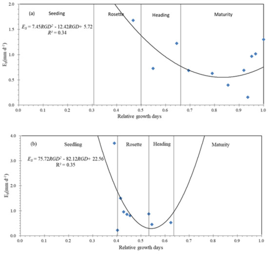 Figure 5a,b also showed a parabolic trend of daily Es with relative growing day throughout the growth period of the two crops (first crop: Es = 7.45RGD2 − 12.42RGD + 5.72, R2 = 0.34; second crop: Es = 75.72RGD2 − 82.12RGD + 22.56, R2 = 0.35). Es decreased from the seedling to late rosette stage and increased in the late growth stage. This change was mainly caused by the fact that the enlarged leaf area covered the ground. In the later stage, the increase in Es was due to the senescence of green leaves and the decomposition of plastic film.