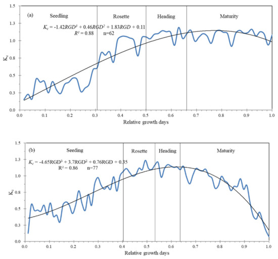 Figure 6a,b show that the Kc of the two crops throughout the growing period exhibited a cubic parabolic trend with the change in relative growing days (first crop: Kc = −1.42RGD3 + 0.46RGD2 + 1.83RGD + 0.11, R2 = 0.87, n = 62; second crop: Kc = −4.65RGD3 + 3.71RGD2 + 0.76RGD + 0.35, R2 = 0.86, n = 77). The daily Kc of the first crop showed an increasing trend from the seedling to heading stage and a small decreasing trend after the heading stage. The maximum value of Kc was 1.19 at the heading stage (8 June), and the minimum value of Kc was 0.15 at the seedling stage (1 May). The maximum Kc on 8 June was probably caused by continuous rainfall on 7 and 8 June. The daily Kc was higher in the middle and late periods, ranging from 0.93 to 1.19. The daily Kc of the second crop showed an increasing trend from the seedling stage to heading stage and a gradual decreasing trend after maturity stage. The maximum value of Kc was 1.24 at the rosette stage (7 September) and the minimum value of Kc was 0.07 at the maturity stage (16 October). The daily Kc was higher in the rosette and heading periods, ranging from 0.98 to 1.24.