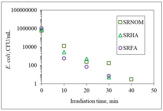 Upon LF SPCI in the presence of NOM analogue compounds, E. coli cell counts displayed a decaying profile with irradiation time, as presented in Figure 1 and Table 1. Almost all of the bacteria were inactivated in 30 min following the trend SRFA ≈ SRHA > SRNOM. Upon a further irradiation period of 40 min, the effect of SRNOM leveled off to both SRHA and SRFA. The SPCI of E. coli using LF in the presence of NOM analogue compounds followed pseudo first-order kinetics irrespective of the type of the organic matrix. E. coli logarithmic reduction profiles indicated that kinetics could well be expressed by the first-order kinetic model, as previously expressed, determined and explained by Birben et al. [].