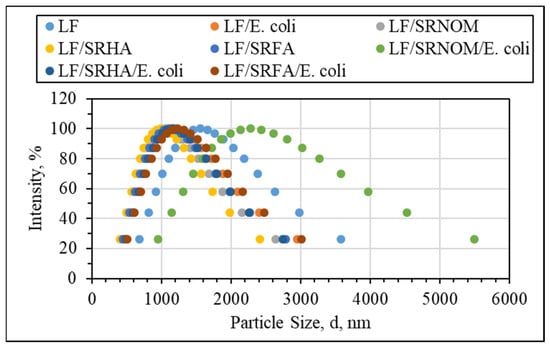 Excluding homo-interactions and as a result of competing and contributing forces, both humic functional groups of organic sub-fractions and those on bacterial surfaces could display high affinities toward the LF surface []. Therefore, the hydrodynamic size of the particulate system expressed variations as measured by the dynamic light scattering technique as presented in Figure 2.