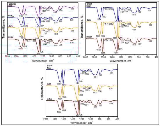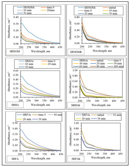 Insignificant absorbance values for λ > 400 nm indicated the absence of chromophoric groups (color-forming moieties) related to the presence of systems including conjugated double bonds, aromatic rings, and phenolic functional groups containing atoms with lone pairs of electrons. Initial conditions revealed the release of organics expressing a shoulder in the 240–280 nm wavelength range. Absorbance values at λ = 280 nm were not significantly different from SRNOMi, SRHAi, and SRFAi. However, in the UV range of λ > 250 nm, a sharp absorbance increase was evident under all conditions irrespective of NOM type. Upon introduction of LF to the suspension composed of E. coli and NOM compounds, the overall effect of surface interactions could be assessed by decreased absorbance values. The resultant organic matrix and E. coli cells were further subjected to solar photocatalysis. Following initiation of light exposure, a time-dependent decrease in absorbance was recorded in all spectral wavelength ranges.