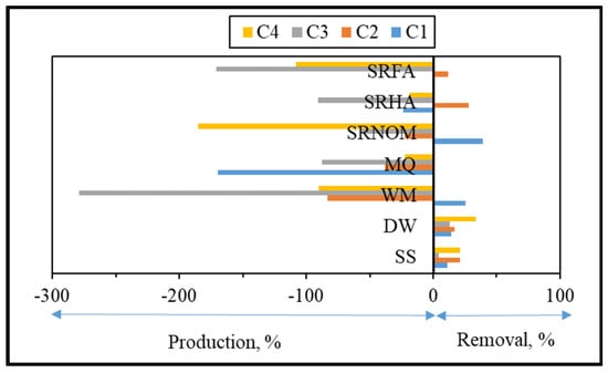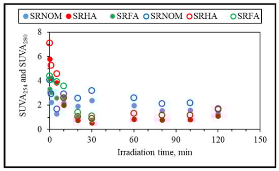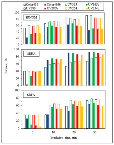 Following an irradiation period of 30 min, UV254 removal efficiencies were reduced from 83% to 49% for SRNOM and from 75% to 59% for SRFA, whereas in the presence of SRHA, the UV254 removal efficiency showed enhancement from 78% to 86%, indicating that the presence of E. coli significantly affects the overall removal efficiency of aromatic content either as enhancement or as diminution. In the presence of both E. coli and NOM analogues, UV254 removal efficiencies of organic matrices were revealed in decreasing order as SRHA > SRFA > SRNOM. The reason could be attributed to the aromatic content of NOM analogues, which has a strong effect on light transmission as well as energy consumption from UVC and solar irradiation []. Enhancement of the removal of specified UV–VIS parameters in the presence of SRHA could be related to its higher degree of aromaticity, as expressed by the SUVA254 value (7.27 L/mg m), in comparison to SRNOM (4.18 L/mg m) and SRFA (4.53 L/mg m) (Table S1).