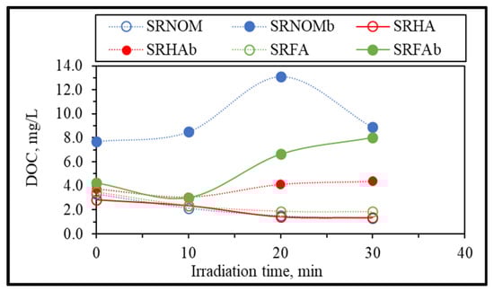 Further evaluation of changes in organic matrices upon solar photocatalytic degradation of NOM compounds in the absence/presence of E. coli was assessed in terms of irradiation-time-dependent changes in DOC contents, as presented in Figure 5.
