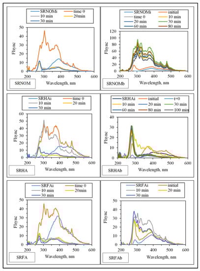 Synchronous scan fluorescence spectral features (indicated as synchronous scan fluorescence intensity, FIsync) of the organic matrix expressed irradiation-time-dependent variations with respect to the NOM analogue type (Figure 7).