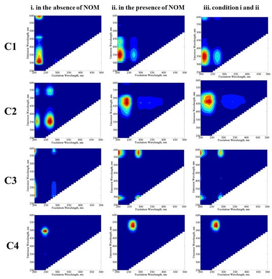In the absence of NOM compounds, component 1 (C1) displayed two peaks at Ex/Em = 210/300 nm and 210/460 nm, which are related to protein/polyphenol-like components; more specifically, C1 could be regarded as a tryptophan-like fluorescent component [,,,]. In the presence of NOM compounds, C1 displayed two peaks at Ex/Em = 210/350 nm and 210/380 nm, which also corresponds to protein/polyphenol-like components. When PARAFAC modeling was run by using all data for conditions i and ii, C1 expressed two maxima at Ex/Em = 210/350 nm, and this component was also classified as a protein/polyphenol-like component. Although the absence and/or presence of NOM seems to cause an insignificant difference in the classification of C1 by PARAFAC modeling, peak positions for the emission wavelength displayed differences in the absence/presence of NOM, which could be attributed to the higher degree of aromaticity related to NOM.