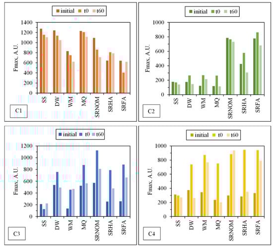 Although half of the experimental studies were performed in the absence of NOM, the PARAFAC model identified two different humic-like components with a highly aromatic structure and a higher molecular weight. The reason of the occurrence of this humic-like fluorescence could be attributed to a hypothetic abiotic condensation process by which carbohydrates and amino acids can produce compounds with a melanin structure []. It was previously reported that this type of reaction may occur between carbohydrates and proteins released by bacteria []. With respect to the experimental data of this study, it has been reported that the SPCI of E. coli ends up with the release of carbohydrates and proteins via cell lysis; therefore, the condensation reaction between these compounds could be the source of humic-like components identified by the PARAFAC model. In addition, another plausible explanation of humic-like fluorescent components could be auto-oxidative crosslinking of unsaturated lipids released by organisms [,]. To perform a further assessment of the fate of individual PARAFAC components following solar photocatalysis, changes in the Fmax values of each component under all experimental conditions are presented in Figure 9. Fluorescent components identified by EEM/PARAFAC have distinct excitation and emission spectra. However, identified components may represent a single fluorophore or a group of similar fluorophores. Once identification of the components explaining the greatest variation proceeded, calculation of the distribution of components could be performed for each sample. PARAFAC modeling could make quantitative determination of an analyte possible by adding a known amount of this analyte for the determination of its concentration in each sample. Otherwise for an unknown PARAFAC component, it is impossible to convert fluorescence intensities to concentration values. Therefore, the maximum fluorescence intensities (Fmax) of the identified DOM components were used as the representative of the relative proportions of the components. Fmax is derived by multiplying the maximum excitation and maximum emission loading for each component by its score, which produces intensities in the same measurement scale as the original EEMs.