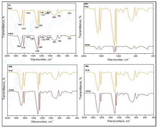 FTIR spectroscopic analyses were performed on selected samples that were prepared by filtration through 0.45 µm membrane filters. Filter papers were placed on a Petri dish and dried at 25 ± 2 °C, with the lids on. ATR-FTIR spectra were recorded between ν4000 and 400 cm−1 on a Nicolet 6700 spectrophotometer (Thermo Fisher Scientific, Waltham, MA, USA) equipped with an ATR sampling device containing a diamond crystal. The spectra were scanned at room temperature in transmission mode with a spectral resolution of 4.0 cm−1. Each spectrum corresponded to an average of 32 scans, using blank filter paper as a reference under the same instrumental conditions before each series of measurements. Processing of the exported data was carried out with the optical spectroscopy software SpectraGryph (F. Menges, Spectragryph-optical spectroscopy software, 1 (2020), version 1.2.14, http://www.effemm2.de/spectragryph/ (accessed on 2 April 2021)).